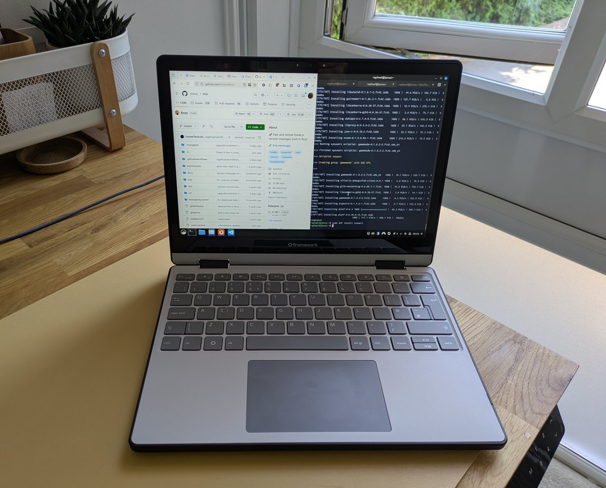 I do already have a list of things which could be improved - some in software, some in hardware. When the laptop is in tent mode, I can't use the media keys on the back, even to adjust the volume. This may be controllable by a BIOS setting. The keyboard isn't backlit, which isn't a concern for me because I touch-type. (Ironically, I'm writing in the dark in bed and I misspelled the word 'touch' three times in that sentence). The Cinnamon DE does not present the greatest touchscreen experience - select boxes don't stay open, the global menu isn't properly scrollable, and the onscreen keyboard is hit and miss - but these can all be fixed by contributing to open source code or switching to a different DE, probably Gnome or KDE. The speakers are quite weak - certainly I was having trouble watching Star Trek in a loud kitchen without headphones. But they were fine for background music while I was writing. The screen bezels are relatively wide for a laptop in 2025, but I'm sure that an improved display will be released in a few years. These are all such minor issues and I already love this little thing so much. I've called it Janus, partly because it flips in two directions but also because it looks forwards and backwards - to the repairable, open hardware of the past, and the innovations we haven't even imagined in the future. It's a laptop shaped like a friend, and I can't wait for the adventures we're going to have in the many years we're going to spend together.